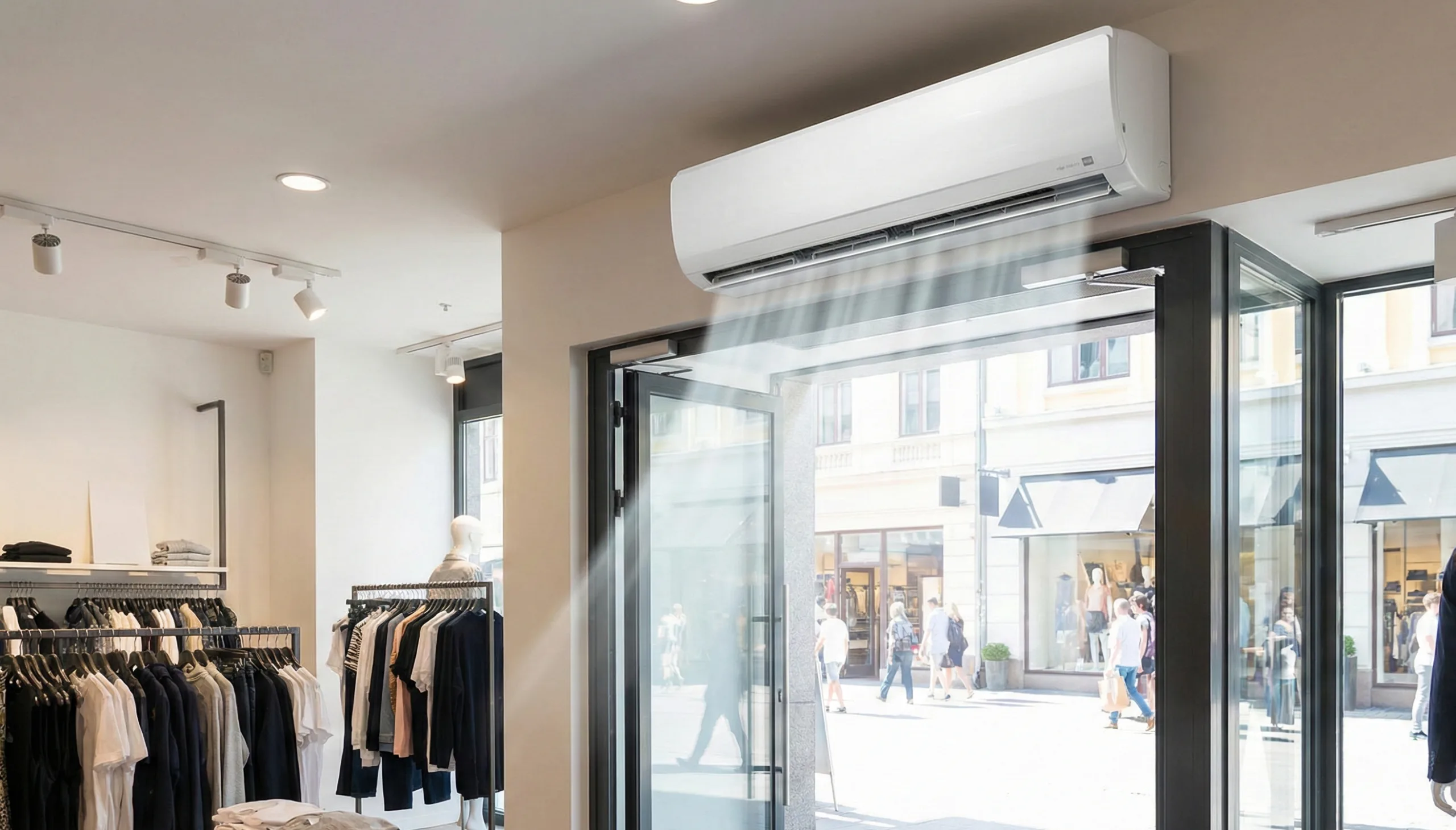 As cortinas de ar são comummente usadas em lojas, supermercados e centros comerciais. Permitem políticas de portas abertas, enquanto mantêm o conforto interior. Isso é particularmente importante em locais com muita afluência de pessoas, onde a abertura e o fecho frequentes das portas podem levar a flutuações significativas de temperatura.